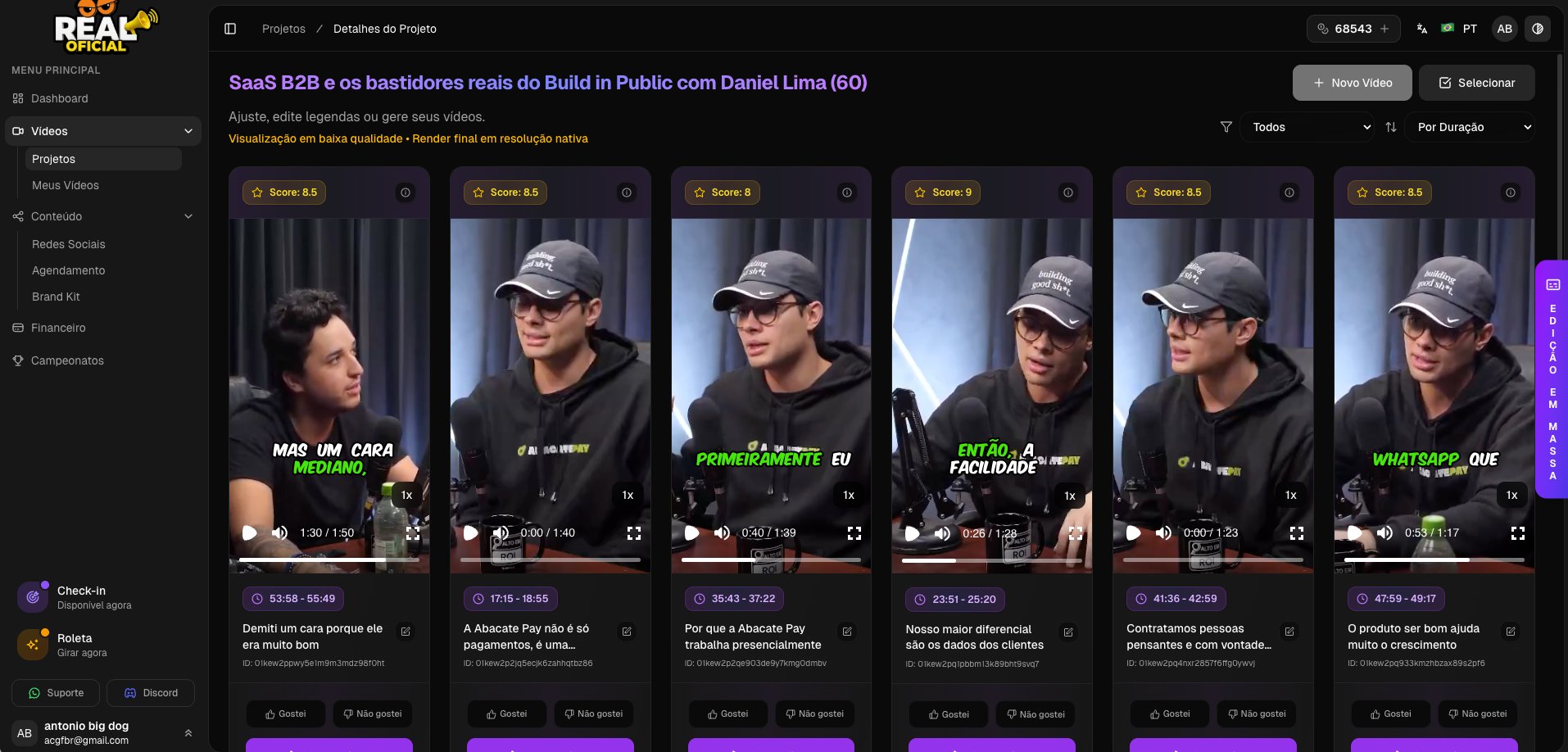 Nossa inteligência artificial identifica automaticamente os momentos mais impactantes e gera dezenas de cortes otimizados para retenção.